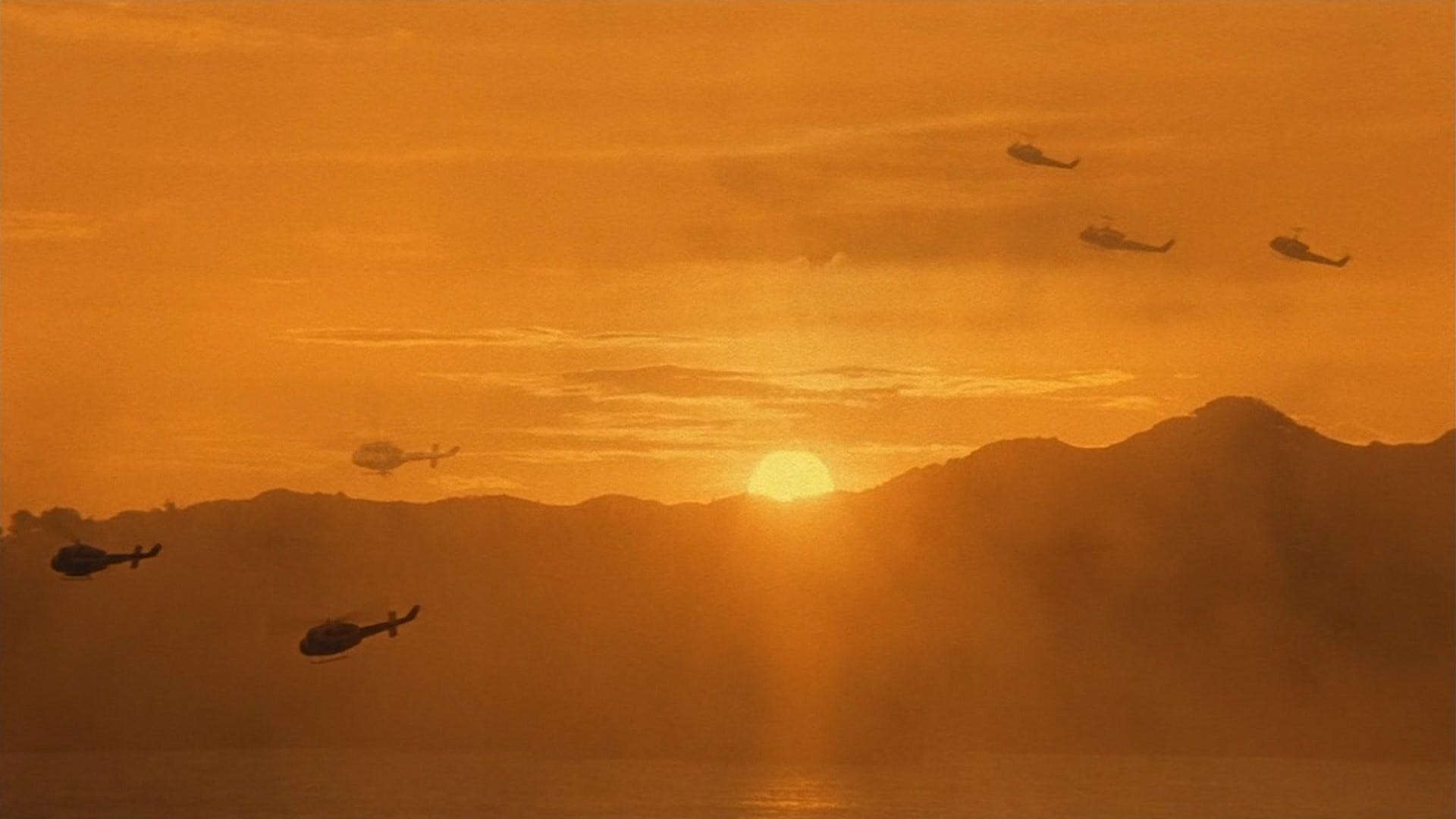 The opening, in which The Doors’ “This Is the End” and the slow-motion sound of a helicopter blade provide the only soundtrack for an anonymous patch of jungle exploding in flames, sets the tone. But it is carried on through Kilgore’s anachronistic use of Wagner’s “Ride of the Valkyries” to intimidate Viet Cong fighters before an airstrike. And it is present in almost every corner of the film.