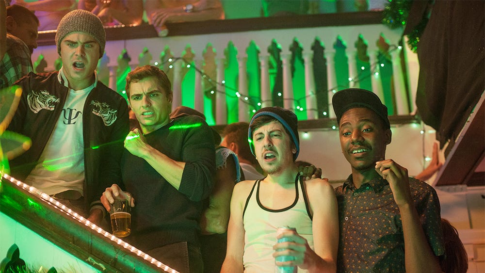Mac and Kelly, played by Seth Rogen and Rose Byrne, are first-time parents moving in to their first home. As you might expect, caring for a newborn while trying to maintain some sense of normalcy and individual agency is a major challenge for the pair -- especially with their single and childless friends tempting them with a night out. And that only gets worse when a raucous fraternity moves in next door. Enter the third character struggling with the prospect of adulthood, the president of said frat Teddy, played by Zac Efron.Teddy is dimwitted but ambitious. Intent on throwing the rager to end all ragers so that he can end up immortalized in the fraternity's Hall of Fame before he graduates, he sets about building momentum with a series of debaucherous soirees. Drugs, drinks, loud music, sexual promiscuity -- this frat has everything that Animal House made cool and that 22 Jump Street so expertly mocked. And those things are problematic for Mac and Kelly.