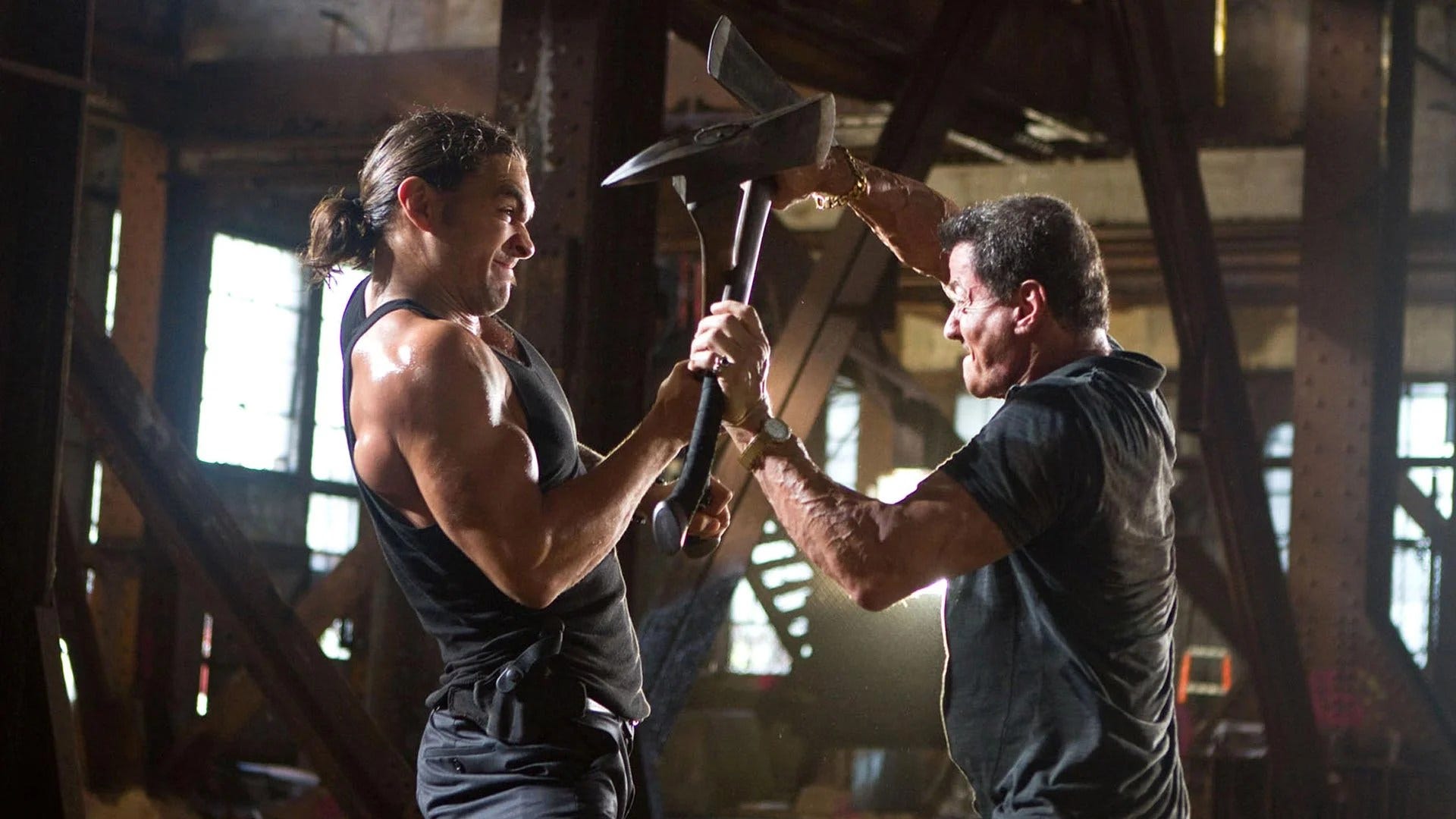 Even better, he plays his part with an unquestioning devotion that is lacking from his obvious counterpart Arnold Schwarzenegger's return, The Last Stand (more on that mess in a few days). Such is Stallone's commitment to his kinda-good-guy's persona that you accept it when he saves his unwanted partner from certain execution and you find it natural when he enters into a final showdown with Momoa that involves axes. Of course this film has to end with an axe fight; it'd be wrong if it wrapped up any other way, wouldn't it?!